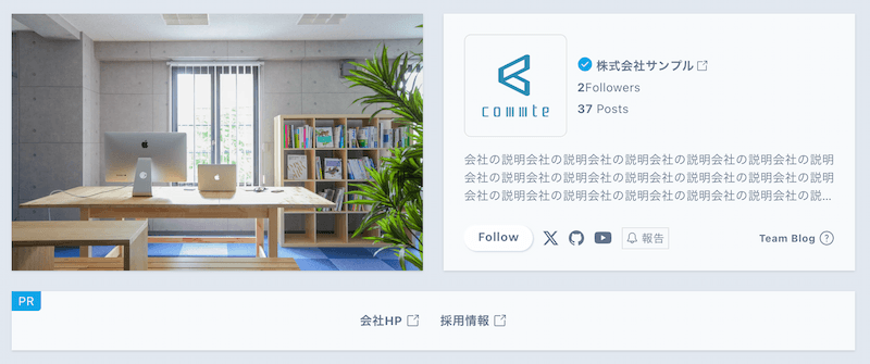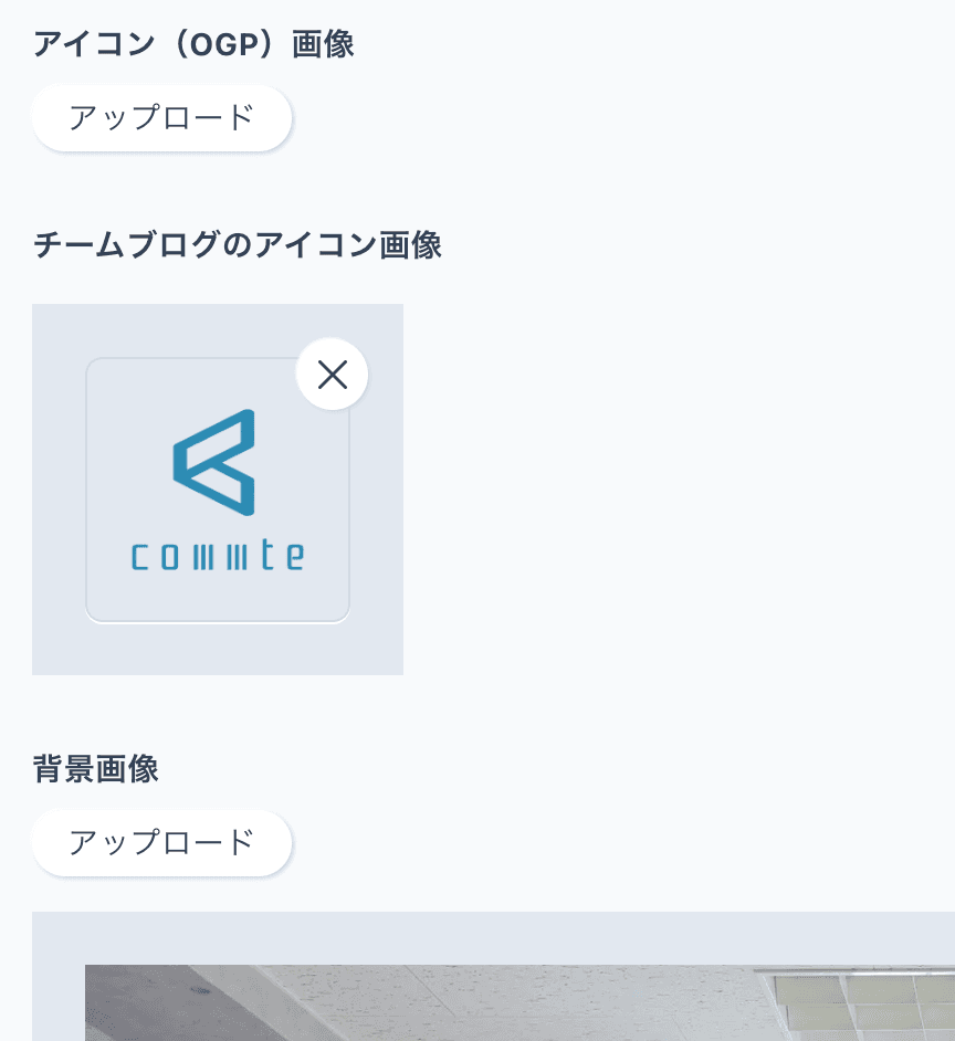 チームブログの背景画像、アイコン(OGP)画像、X、GitHub、YouTube のアカウントへのリンクを設定することができます。背景画像が不要な場合は、背景を削除するか未設定にすることでシンプルな模様がランダムに表示されます。