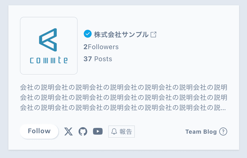 チームブログの承認が完了し、設定を保存すると、認証バッジ、背景画像、アイコン、外部リンク等が表示されます。認証バッジは、チームブログの資格基準を満たしていることを示します。