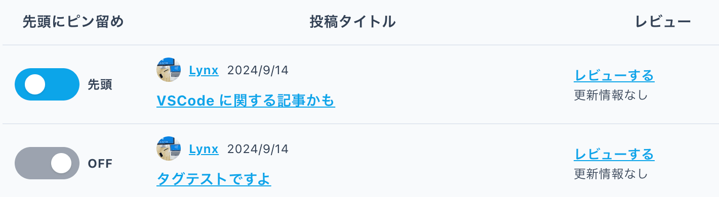 チームメンバーの記事一覧が表示され、チームブログ一覧の先頭にピン留めすることができます。