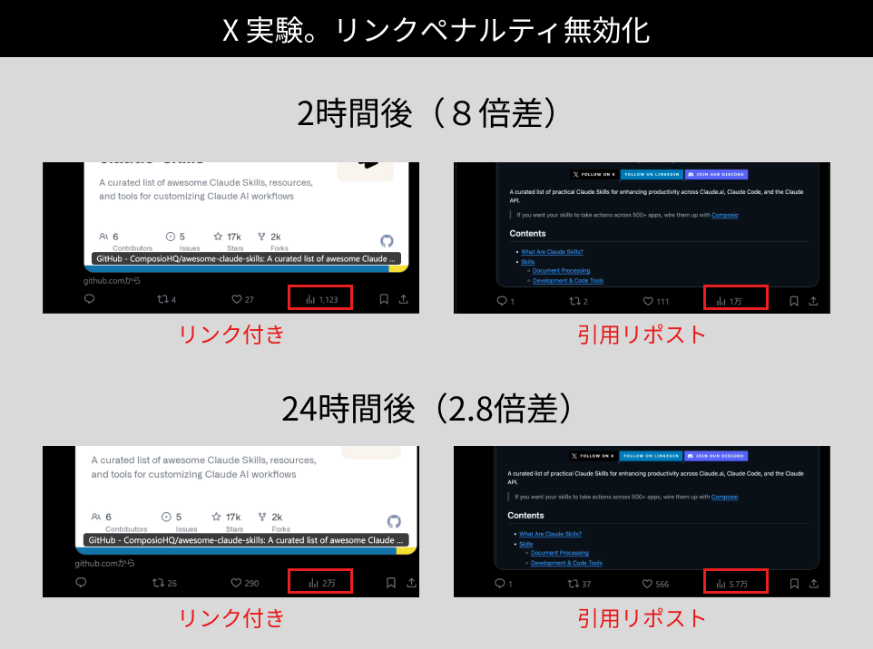 ワイの実験では初動 1 時間で 8 倍の差が出たけど、24 時間後には 2.8 倍まで縮まった。これが意味するのは、リンクペナルティには「時間経過による緩和」があるってこと。初動では大きくペナルティを受けるけど、一定のエンゲージメントが蓄積されると、For You タイムラインへの推薦が再開される傾向がある