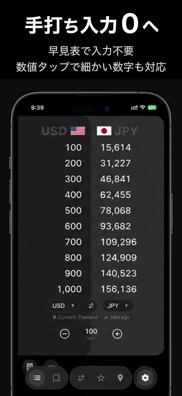【GPSで自動同期】 アプリ起動時や任意のタイミングでGPSを使用し、現在地や近隣諸国の通貨へ即座に・まとめて切り替えます。