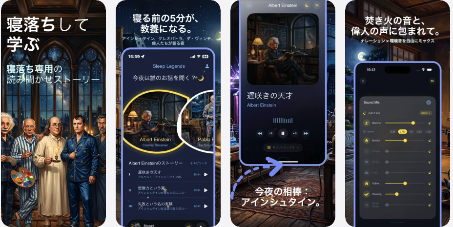 Sleep Legendsは、歴史上の偉大な人物たちの物語を「おやすみ前の読み聞かせ」スタイルでお届けする、まったく新しい睡眠アプリです。