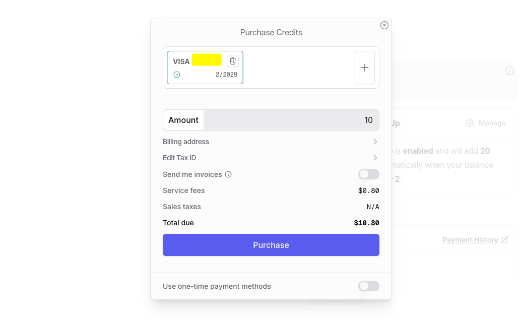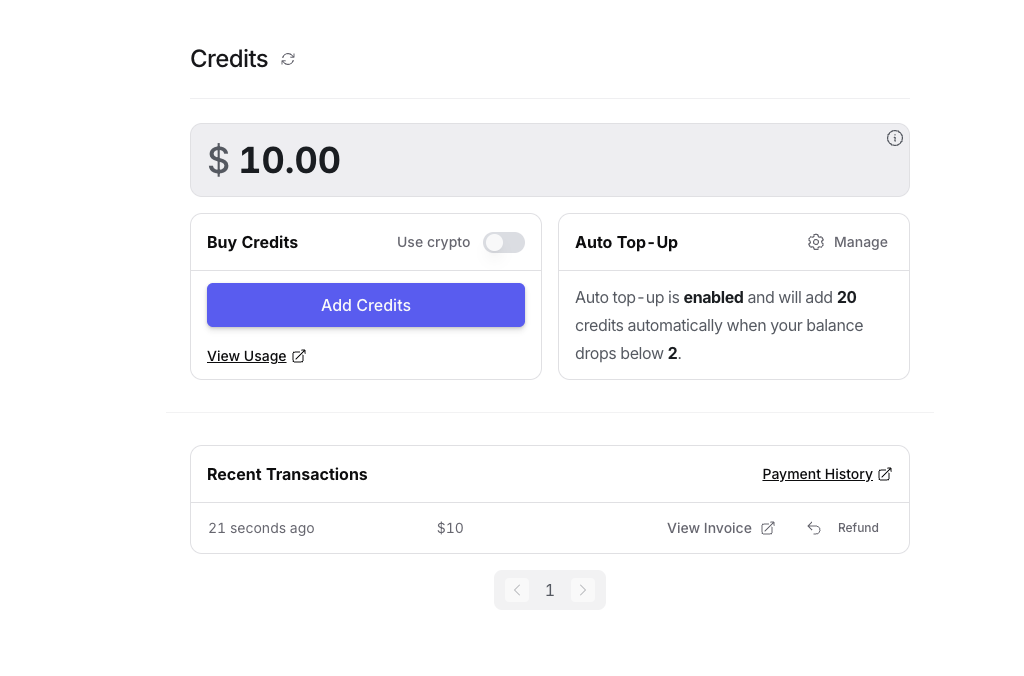 - When credits are below: 追加購入を実施する閾値(ドル)。残クレジットがこの値を下回ったら、自動購入が行われる。