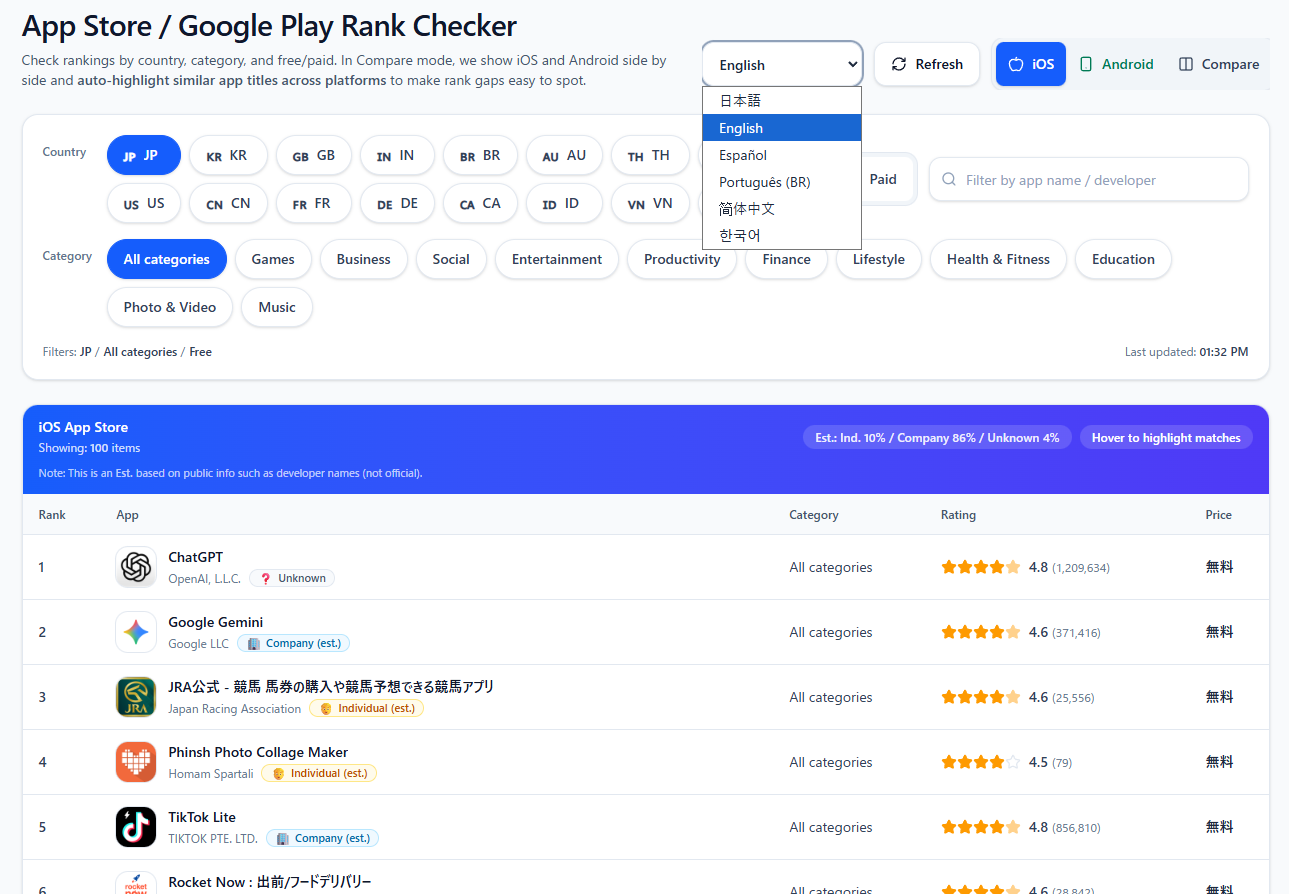 - ASO/マーケ担当: 国・カテゴリ・無料/有料ごとに競合の顔ぶれを素早く比較したい