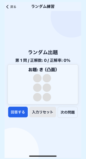 学んだ点字をテストできます。すべての回答が終わりましたら、自分の回答と正答、正答率などが確認できます。