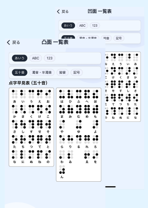 点字おけいことは、凸面・凹面の一覧表、練習、テストの機能を備えており、点字の暗記から定着までこのアプリで学習することができます。