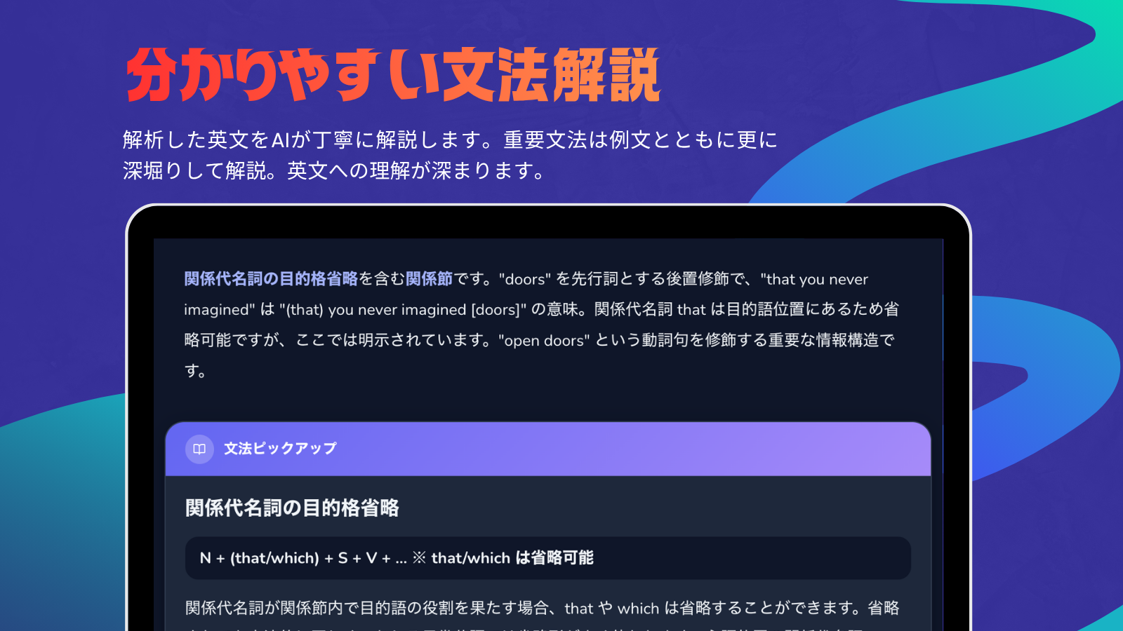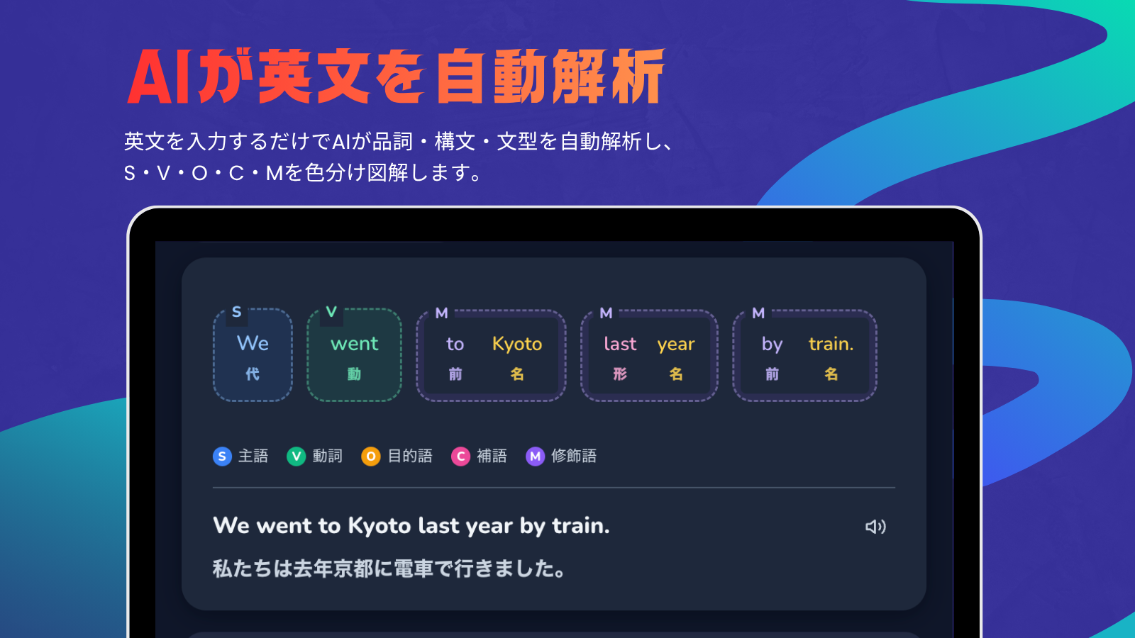 - AI構文解析 — 品詞・構文・文型を自動解析し、S・V・O・C・Mを色分け図解