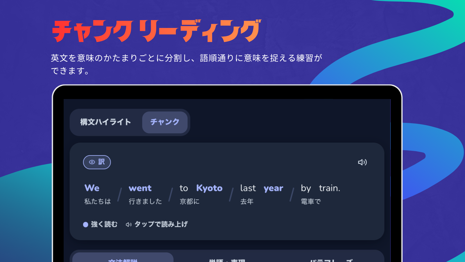 - チャンク&リーディング — 意味のかたまりごとに分割し、前から順に日本語訳を表示