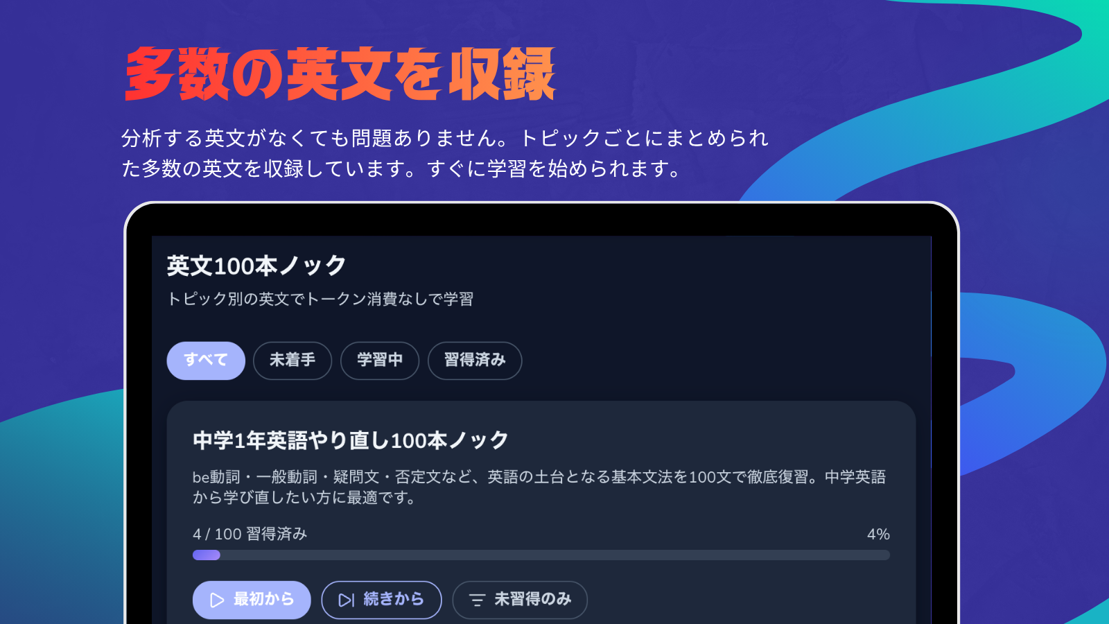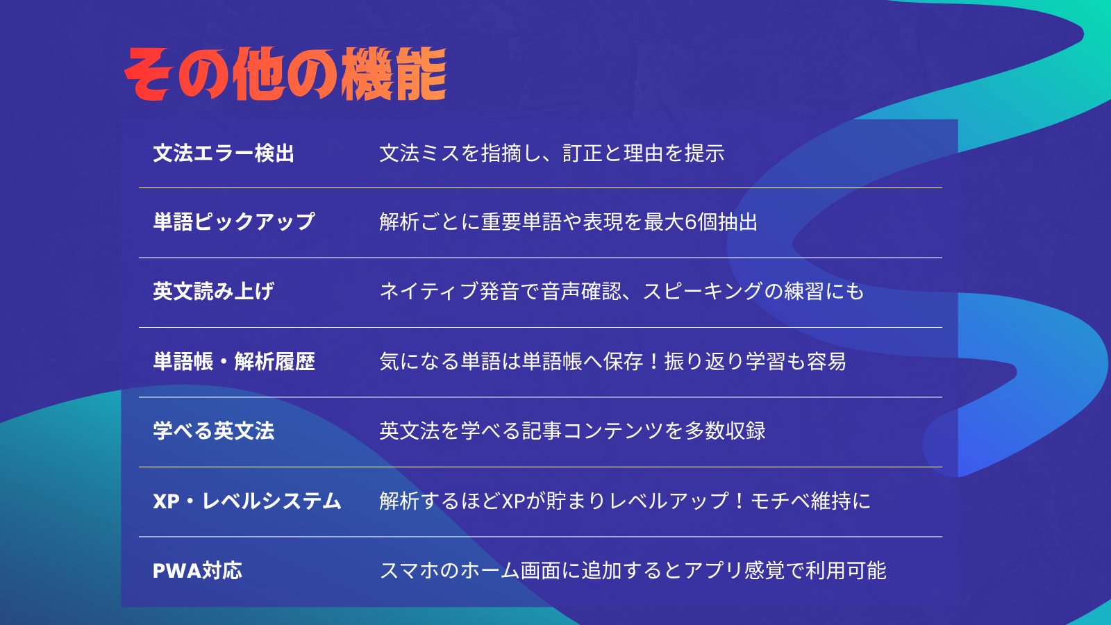 英語学習における「文法の壁」を取り除くこと。難解な英文も、構造を可視化することで誰でも理解できるようにします。 AIの力で、一人ひとりに合った学習体験を提供し、英語力の向上を支援します。