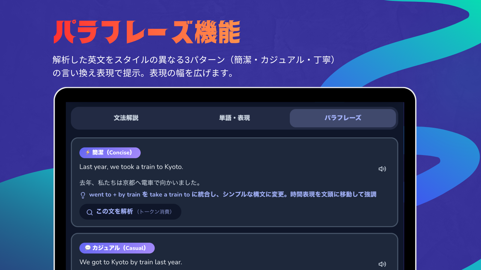 - パラフレーズ提案 — Concise・Casual・Formal の3スタイルで別表現を提示