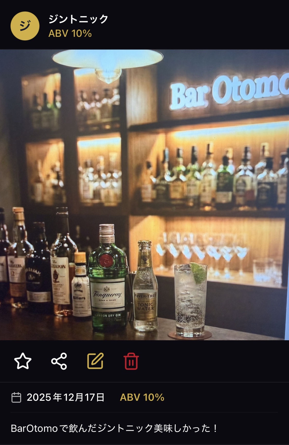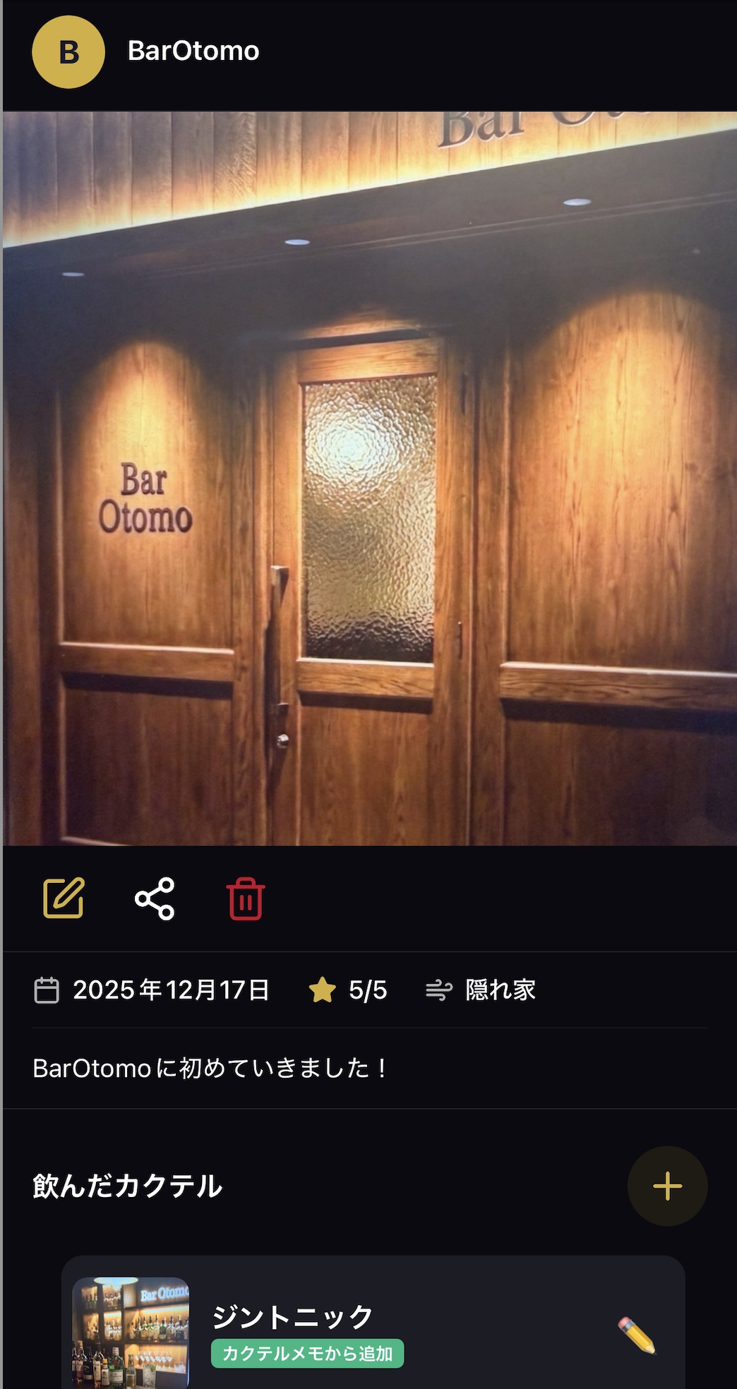 Barの名前、場所、写真、メモを保存できます。お気に入りの「行きつけ」リストを作成できます。