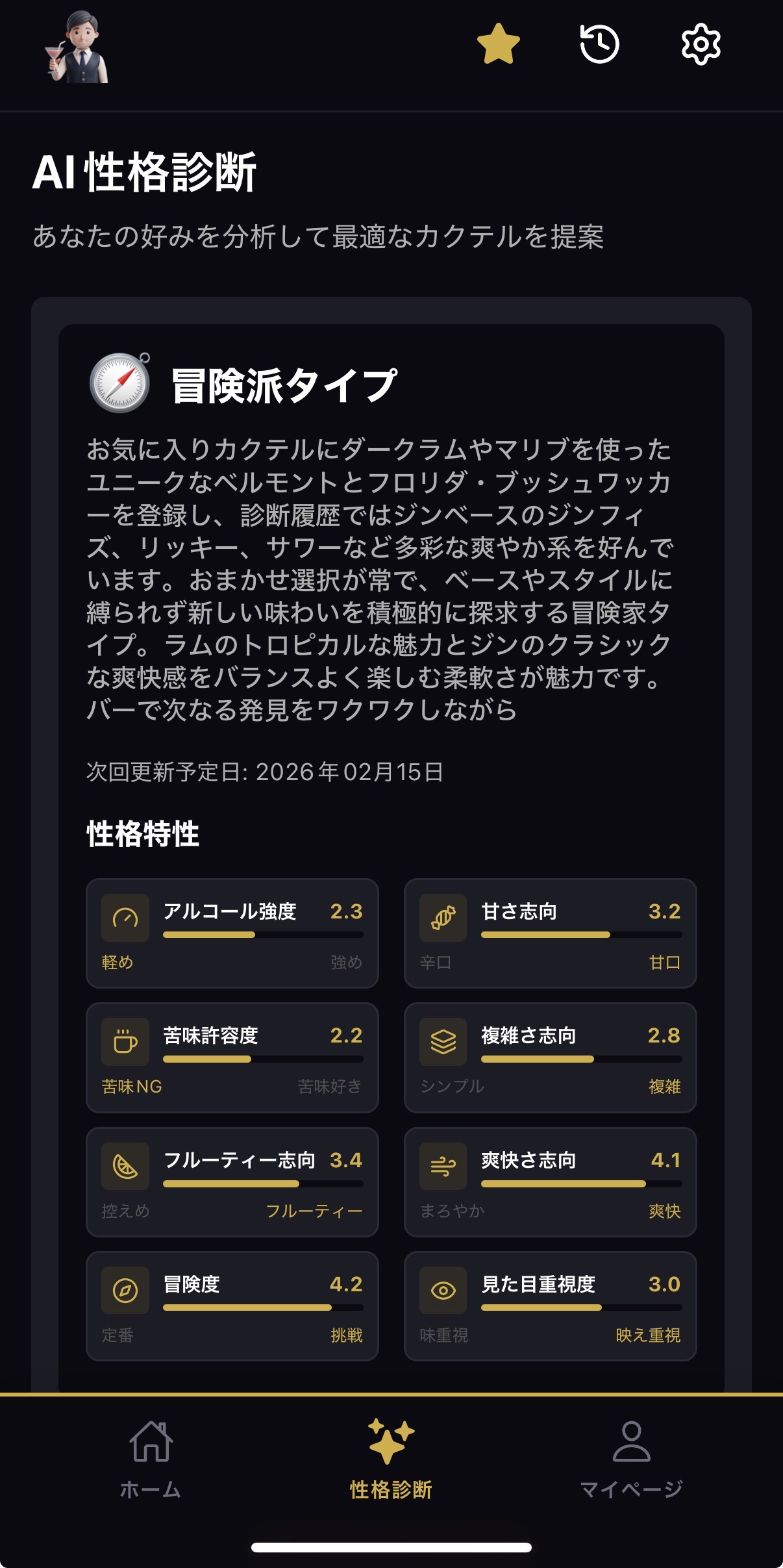 | AI性格診断 | カクテルの好みから15タイプに分類 | 全プラン |