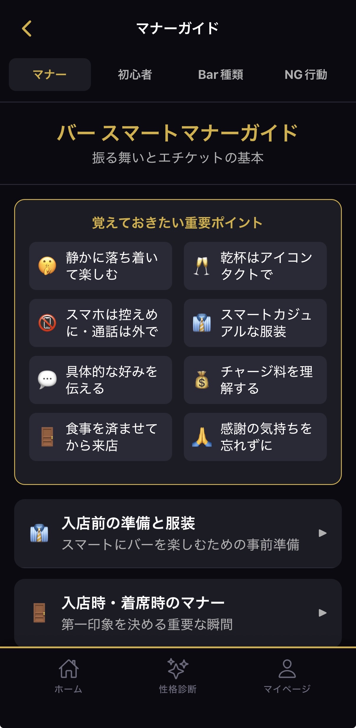 AI診断・注文アシスタント・マナーガイド・カクテルの知識でBar体験をトータルサポート。初心者から上級者まで、すべての人のBar時間を豊かにする機能をご紹介します。