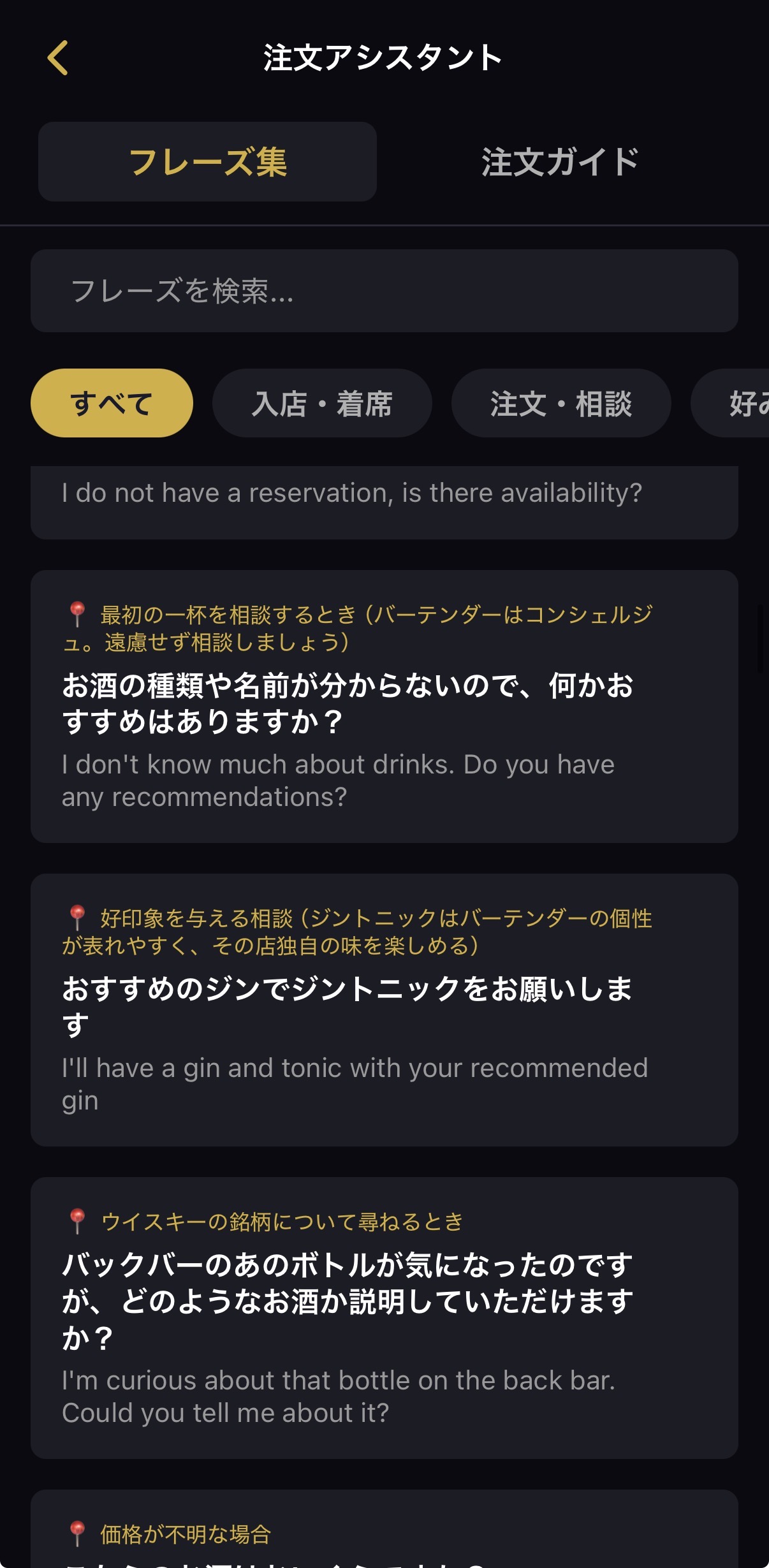 | 質問 | 「このカクテルの材料は?」「ノンアルコールはありますか?」 |