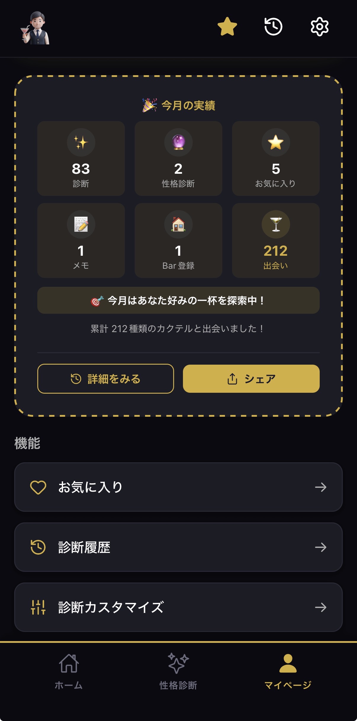 累計で何種類のカクテルと出会ったかも表示されます。自分だけのBar体験ログとして、成長を実感できます。