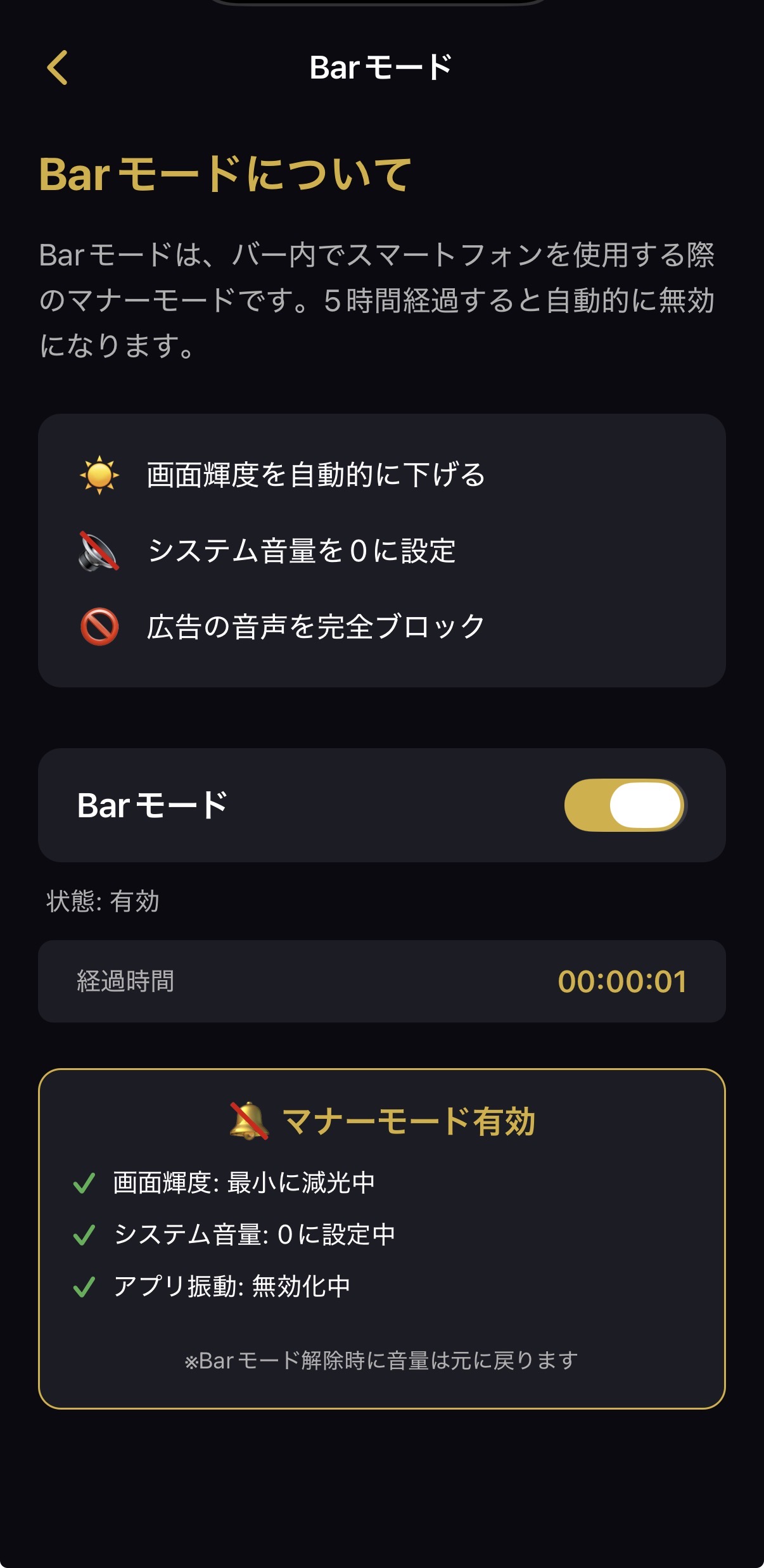 静かなBar店内で目立たずにアプリを使える特別モードです。