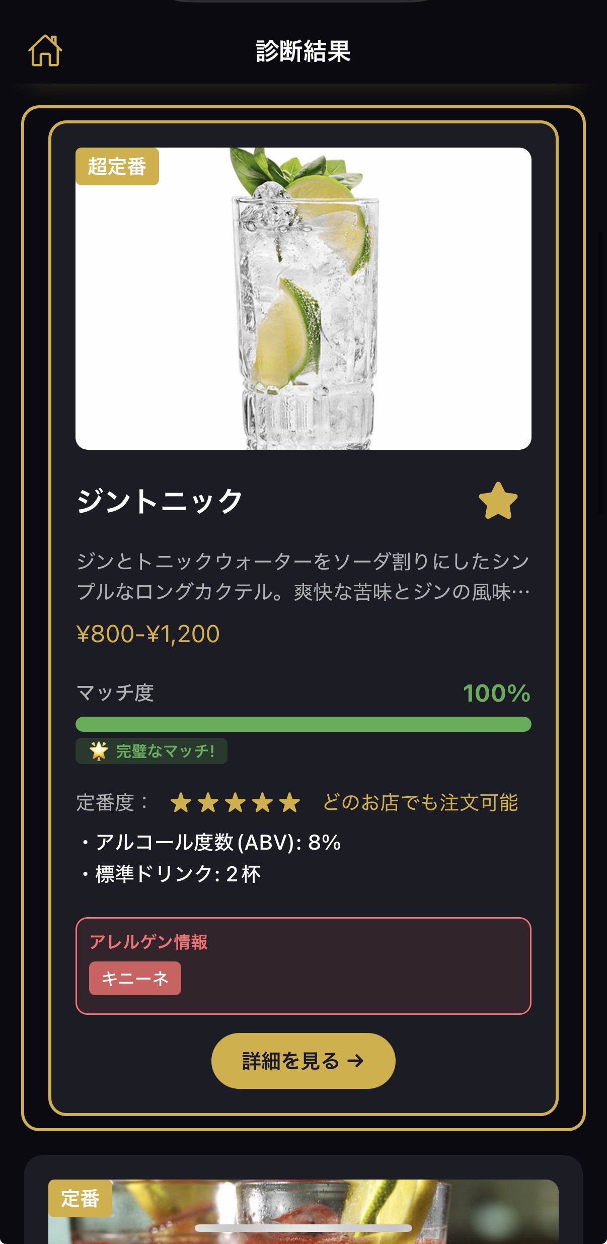 BarOtomoのメイン機能です。8つの質問に答えるだけで、AIがあなたにぴったりのカクテルを提案します。