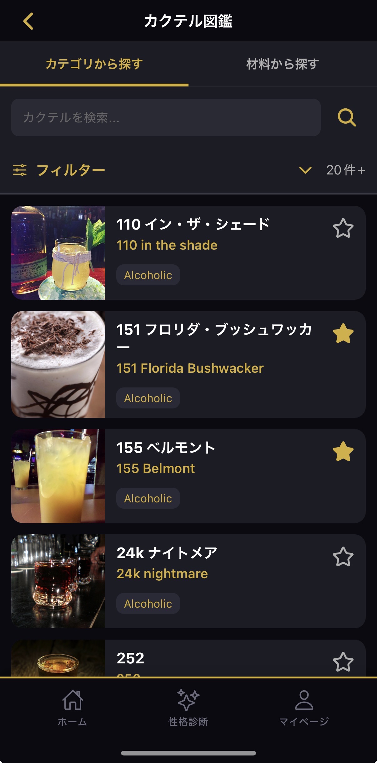図鑑で見つけたカクテルは、そのままお気に入りに登録できます。