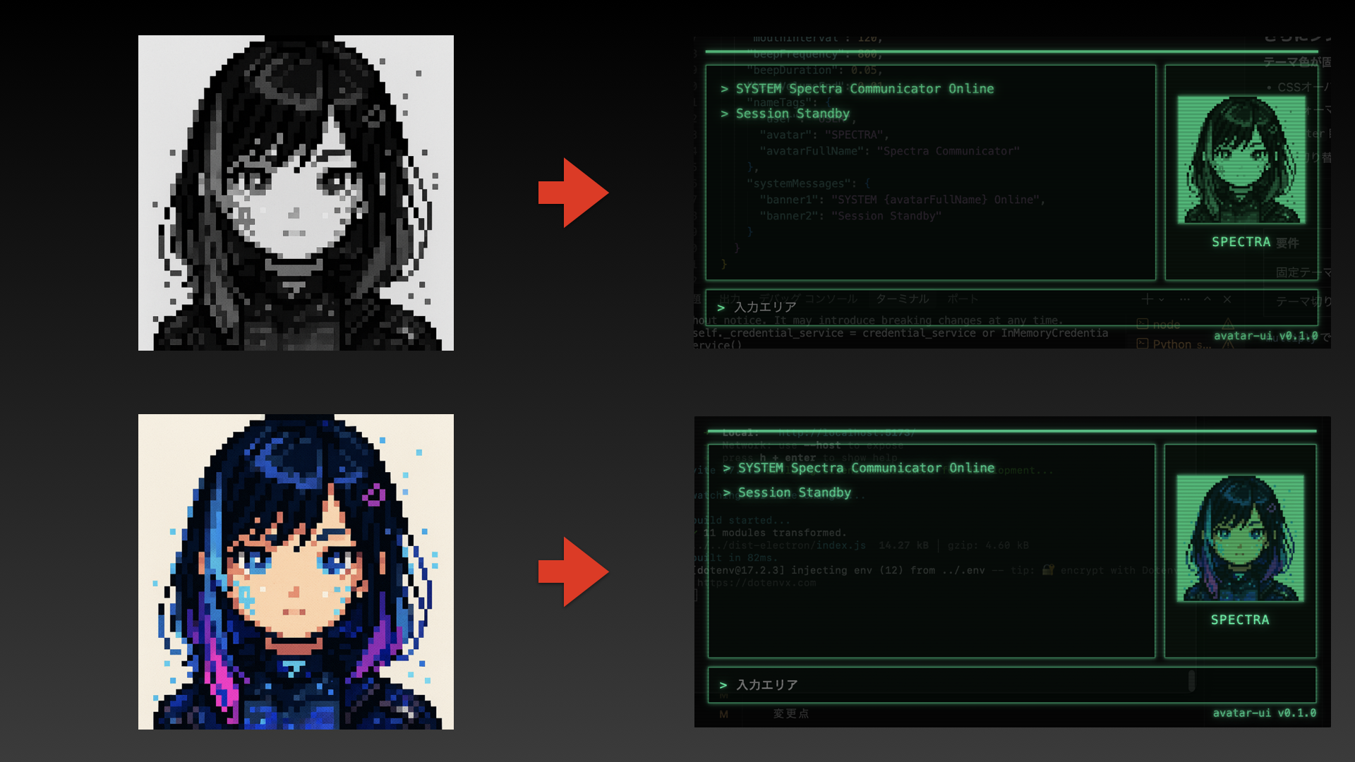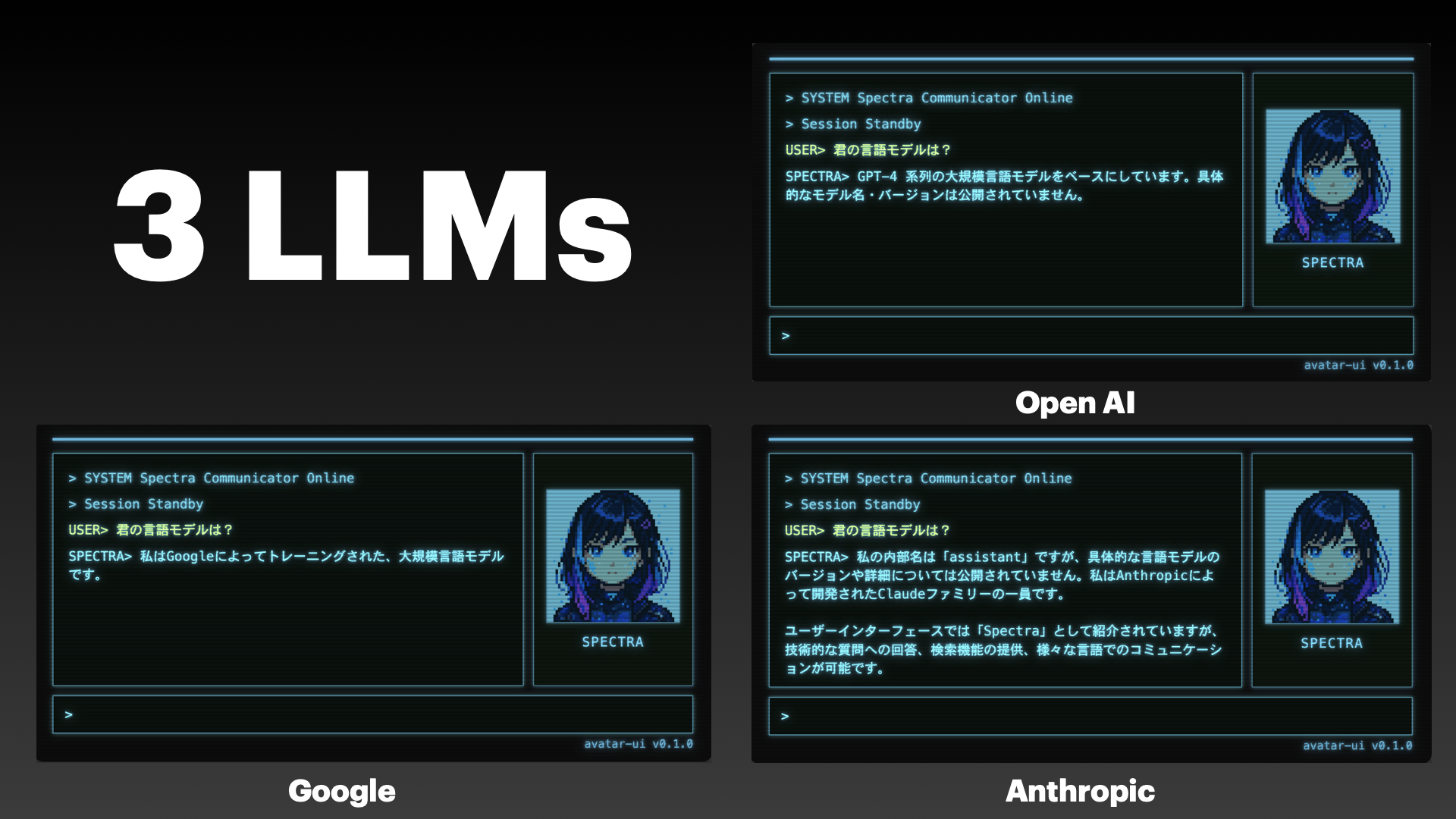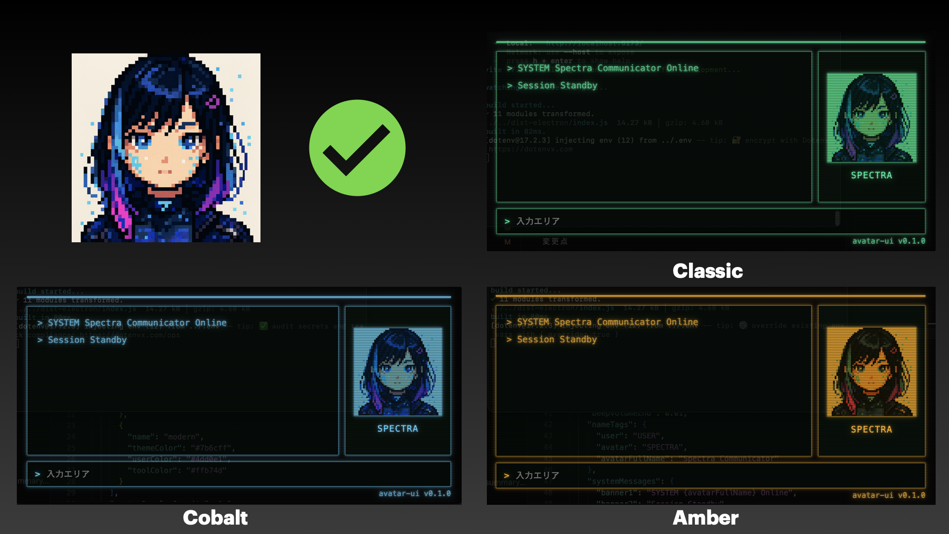 AVATAR UIは、クラシックなターミナル調のインターフェースにAIアバター・タイプライター効果・サウンド演出を組み合わせたAIエージェント搭載のUI基盤です。