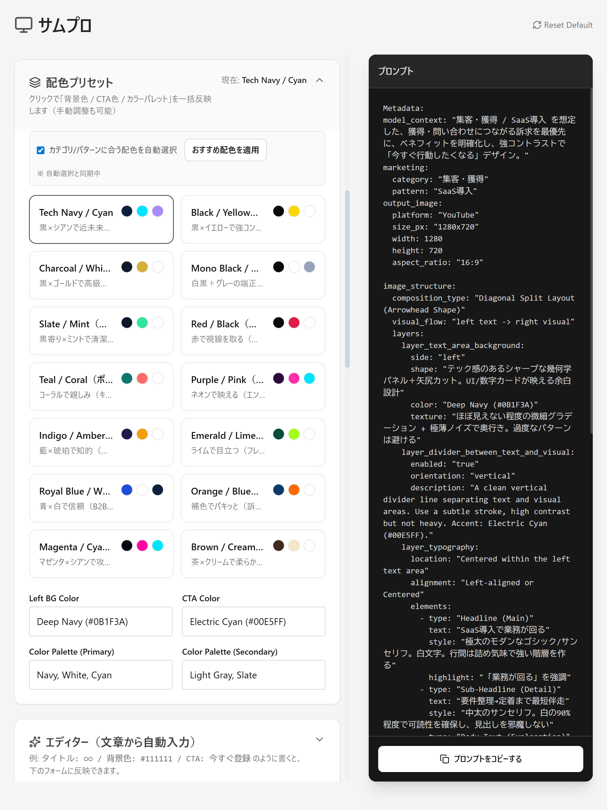 GUI上で「構図」「テーマ」「ターゲット」「配色」を選択するだけで、裏側で最適なプロンプトエンジニアリングが施された指示書を生成します。