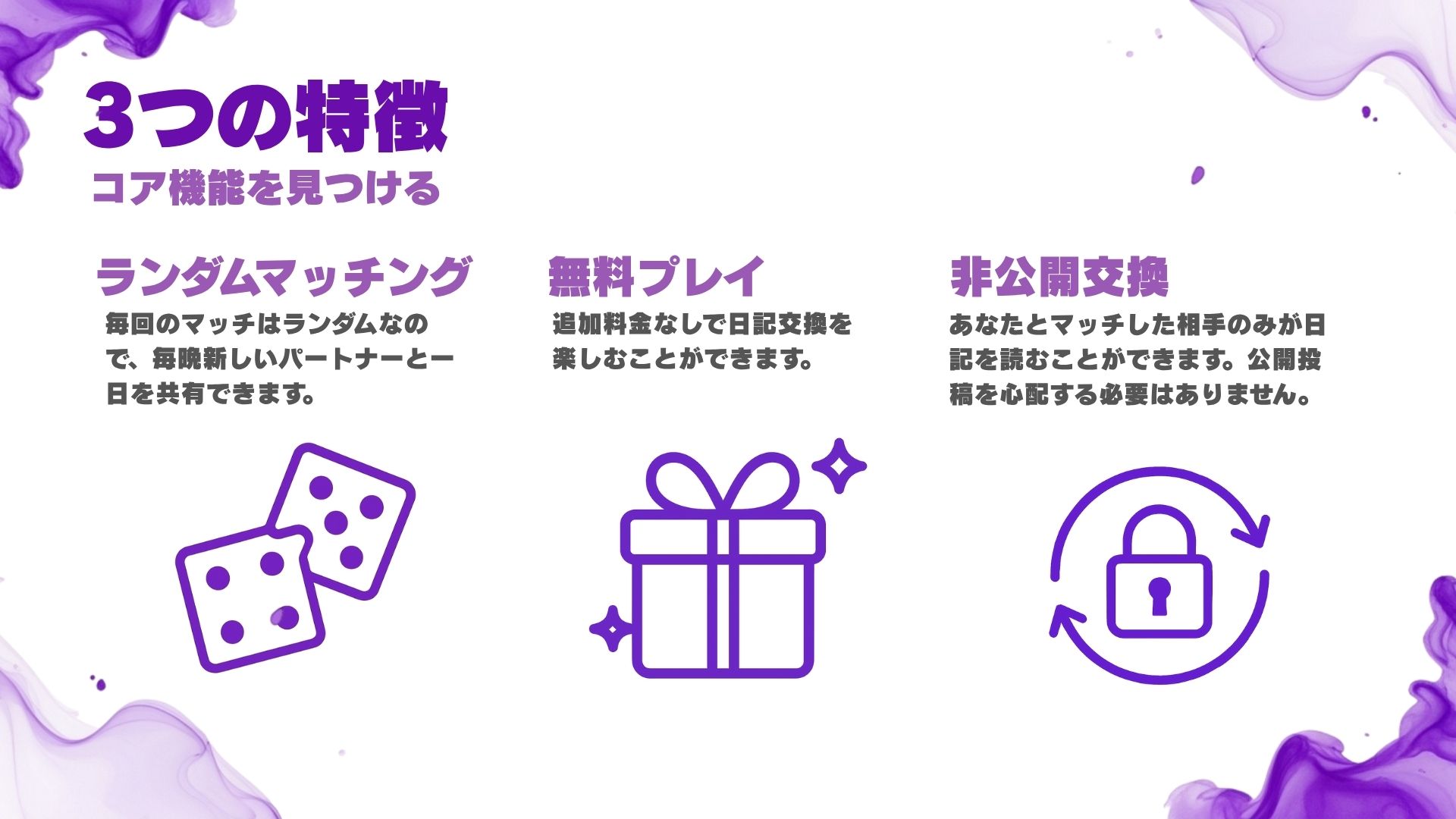 - 非公開設計: 公開投稿なし。読めるのは自分かマッチした相手のみ
