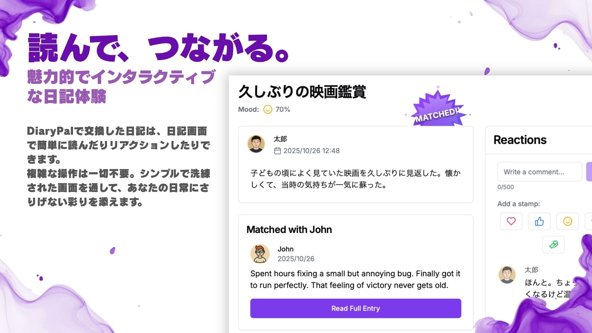 - 相手の日記を読み、スタンプ or ひとことでリアクション