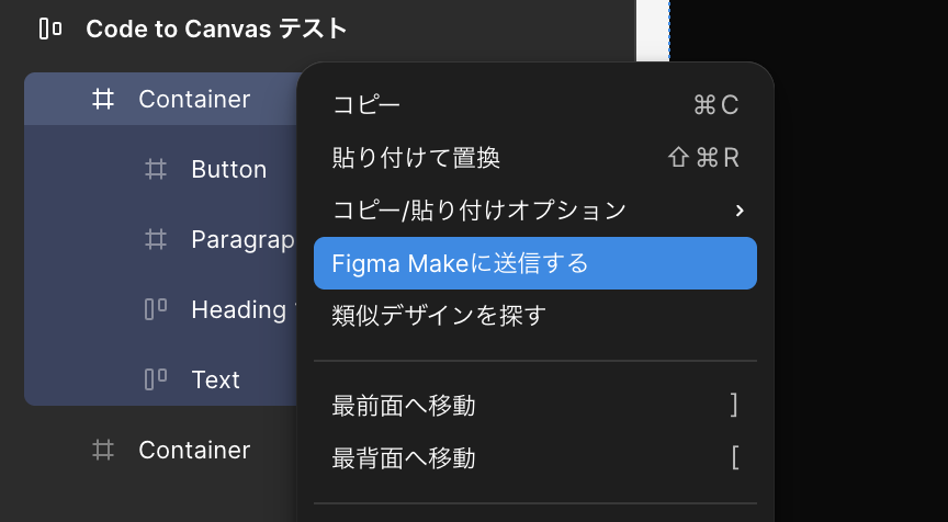 @Emukei_さんに教えてもらったんだけど、Figma Design に取り込んだフレームを右クリックすると「Figma Make に送信する」というメニューが出る