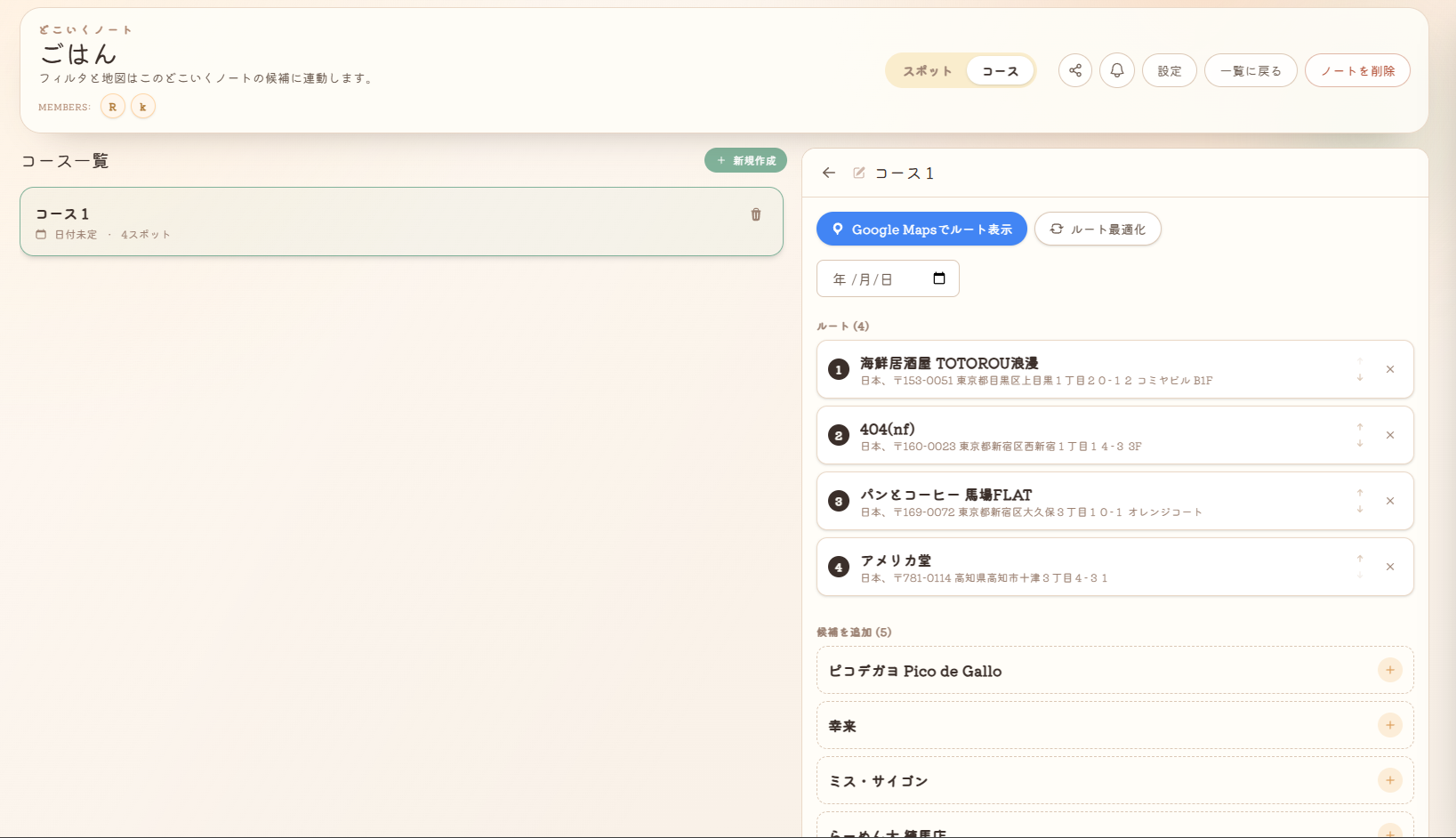 どこいくノートにいれた候補地から、今回いく候補地を選んでルートを作成できます。ルート最適化をおすと近い順にならべかえてくれます。