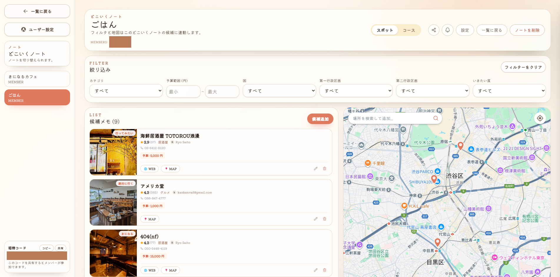 また、ワークスペースには何人でも招待することができ、みんなで候補地を追加していくことができます。