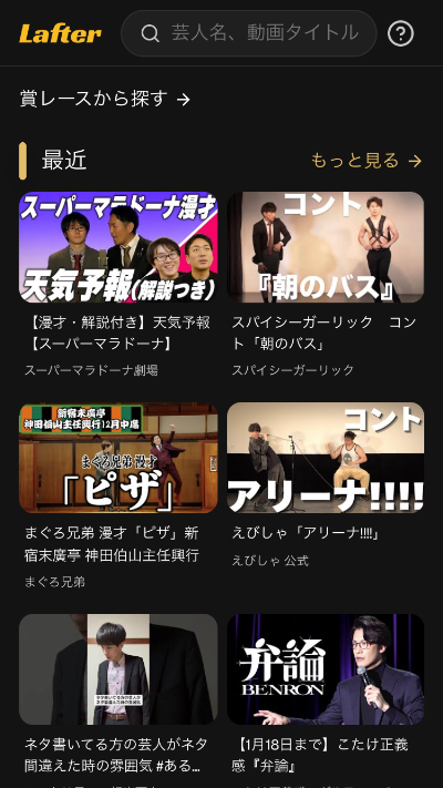 Lafterは「おすすめの押し付け」ではなく、ユーザーが自分の意思でネタに辿り着けることを重視しています。検索・最近・ランダムに加えて、賞レースまとめや人気順といった導線を用意し、迷わず“ネタ視聴”に入れる体験を目指しました。