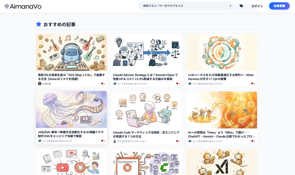AimanaVo(エーアイマナボ)は、AI活用の実践知見が集まるナレッジプラットフォームです。