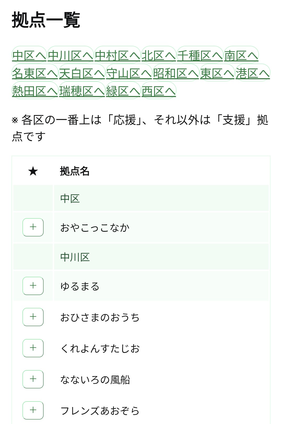 - 名古屋市(愛知県)の子育て拠点のみ。私の居住地