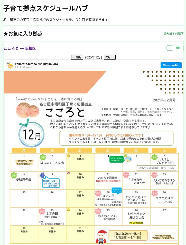 端的にこのアプリは、「子育て拠点のInstagramのスケジュールを埋め込み表示する」だけです。