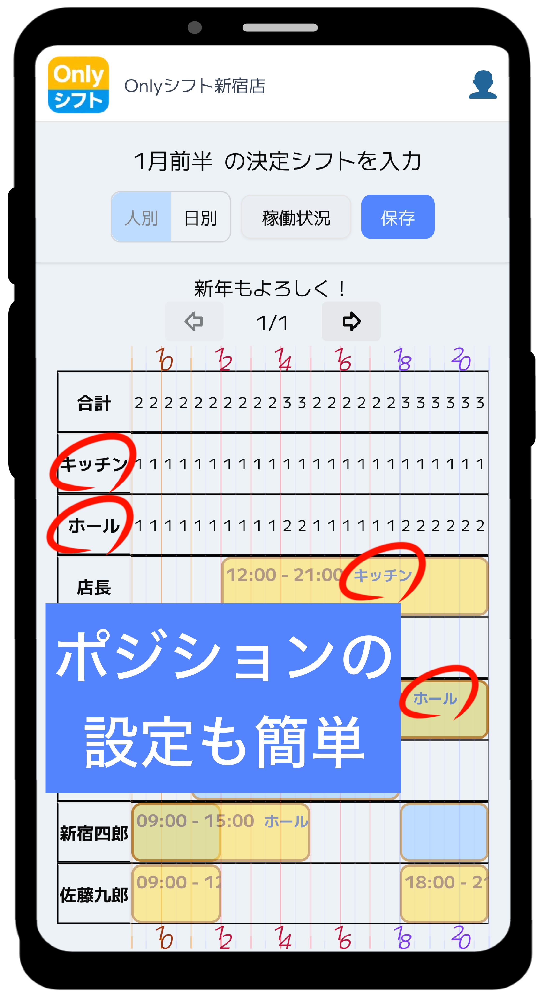 キッチン、ホールなど、時間毎のスタッフ数を一目で確認