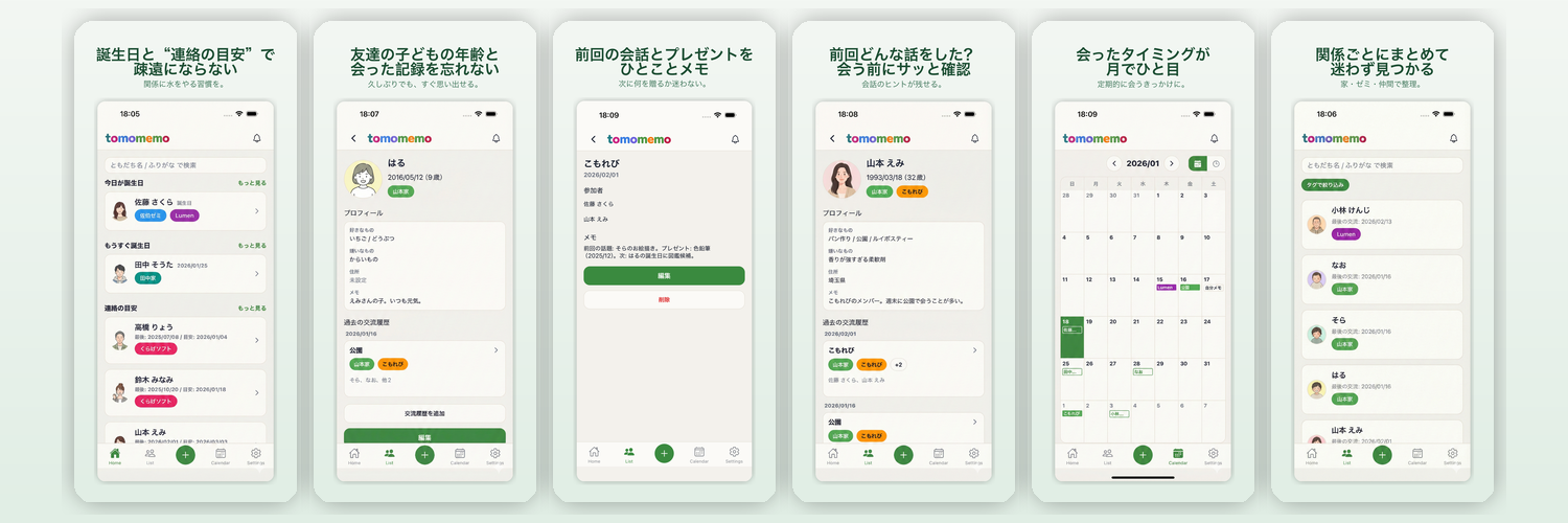「いつ」「どこで」「何をした/何を話した」を軽く残せるので、久しぶりに会う前でもサッと確認できます。